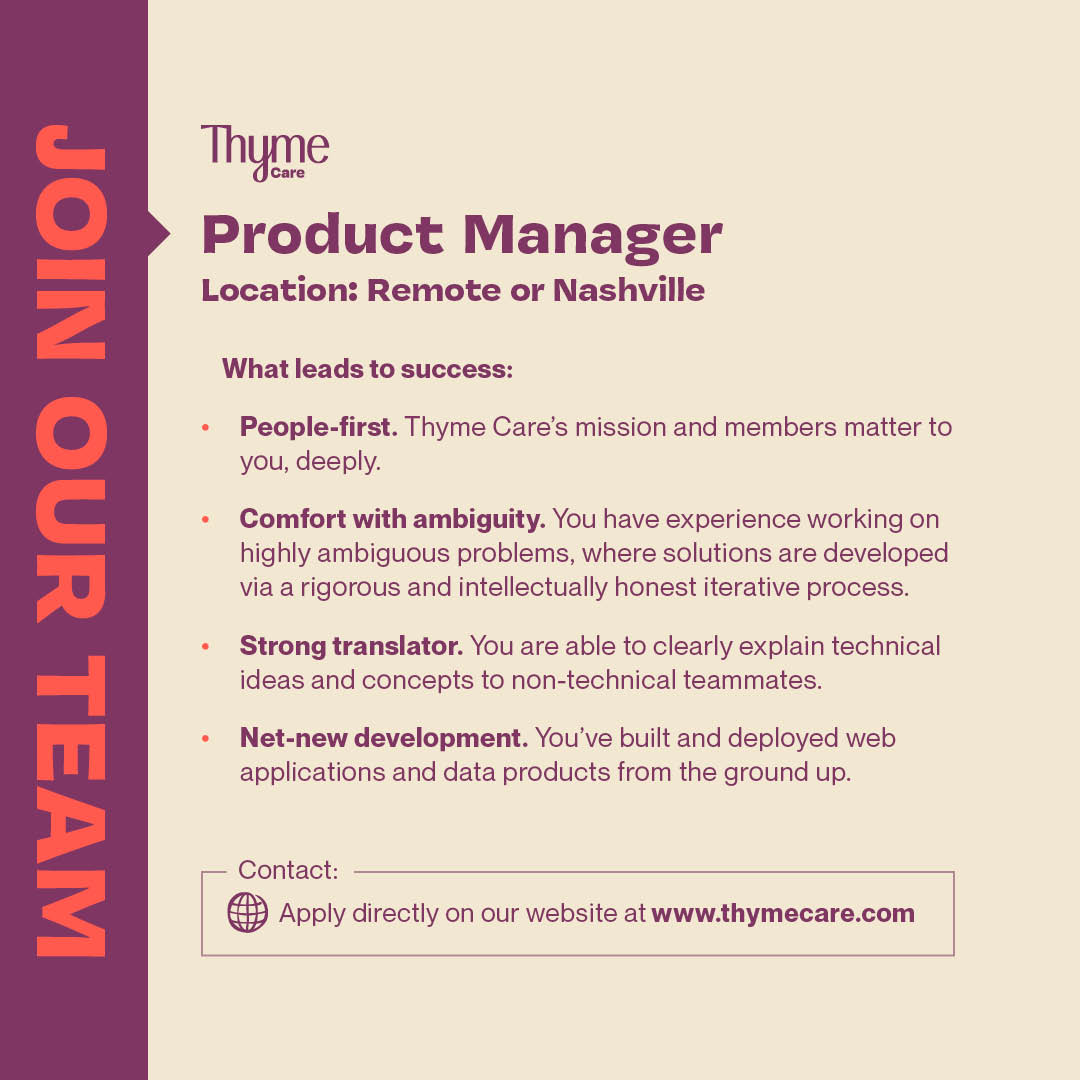 Thyme Care On Twitter We Are Looking To Hire A Product Manager Location Remote Or Nashville Hours Full Time Apply For This Job Now Https T Co Uub2t2qwit Startups Jobs Hiring Remotework Remotejobs Werehiring Recruiting